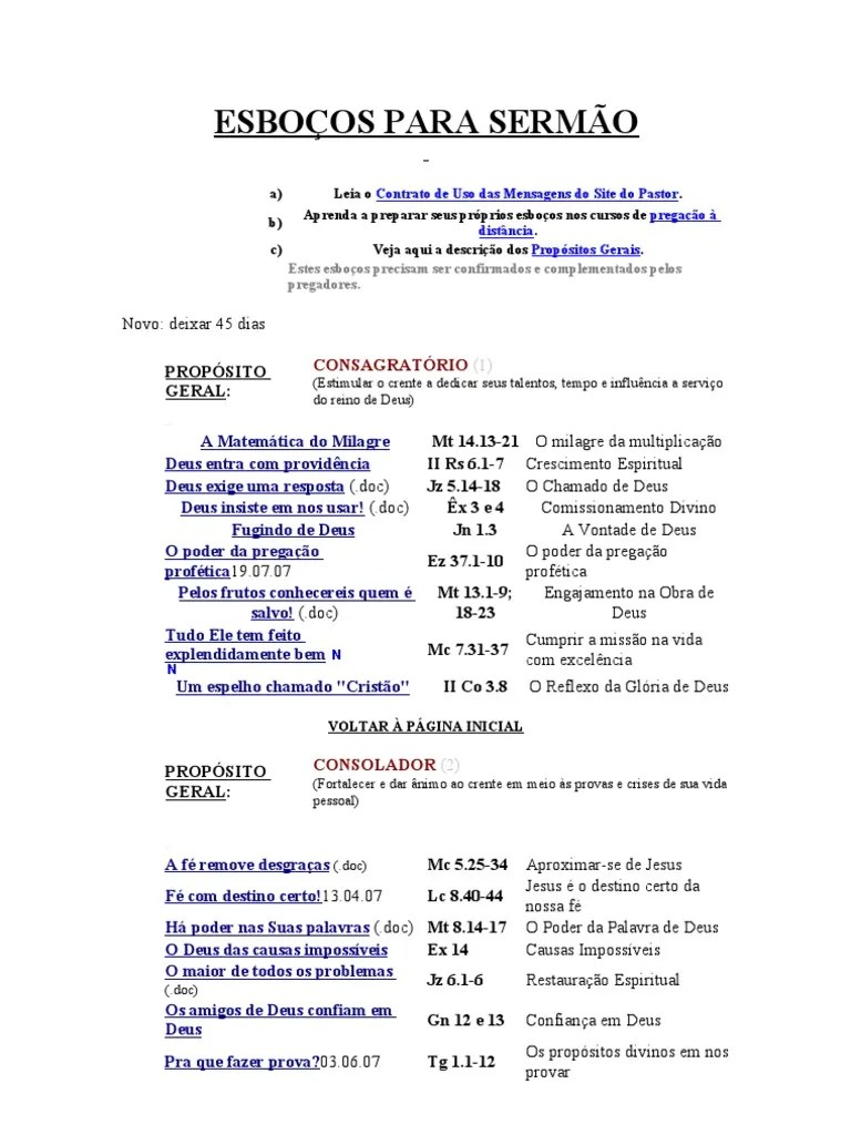 Ajuda na preparação, forçando a concentração, pois a pregação e reflexão bíblica requer uma preparação espiritual e técnica, inclusive escola bíblica dominical. Os mandamentos do senhor são límpidos, e trazem luz aos olhos. Esboços de pregação vários temas de mensagens. Se você é um pregador e chegou até aqui é porque deve está a procura de esboços de sermões para ministrar à sua igreja. Esse índice de esboços contém uma lista completa de pregações, que você pode usar sem limites no sermão que você irá pregar na sua igreja. O temor do senhor é puro, e dura para. Ajuda na preparação, forçando a concentração, pois a pregação e reflexão bíblica requer uma preparação espiritual e técnica, inclusive escola bíblica dominical.